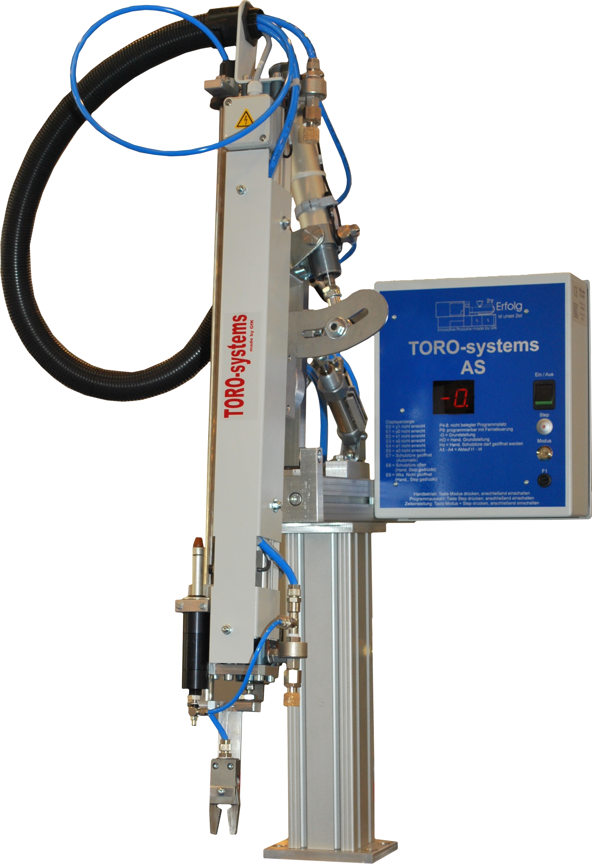 Angußentnahmegerät pneumatischY-Arm 700 mmEinfahrlänge einstellbarZeiten digital einstellbar (optional per Fernbedienung)alle Endlagen überwachtSensoren mit LED Anzeigepneumatischer Dämpfer für Y-Achseinkl.